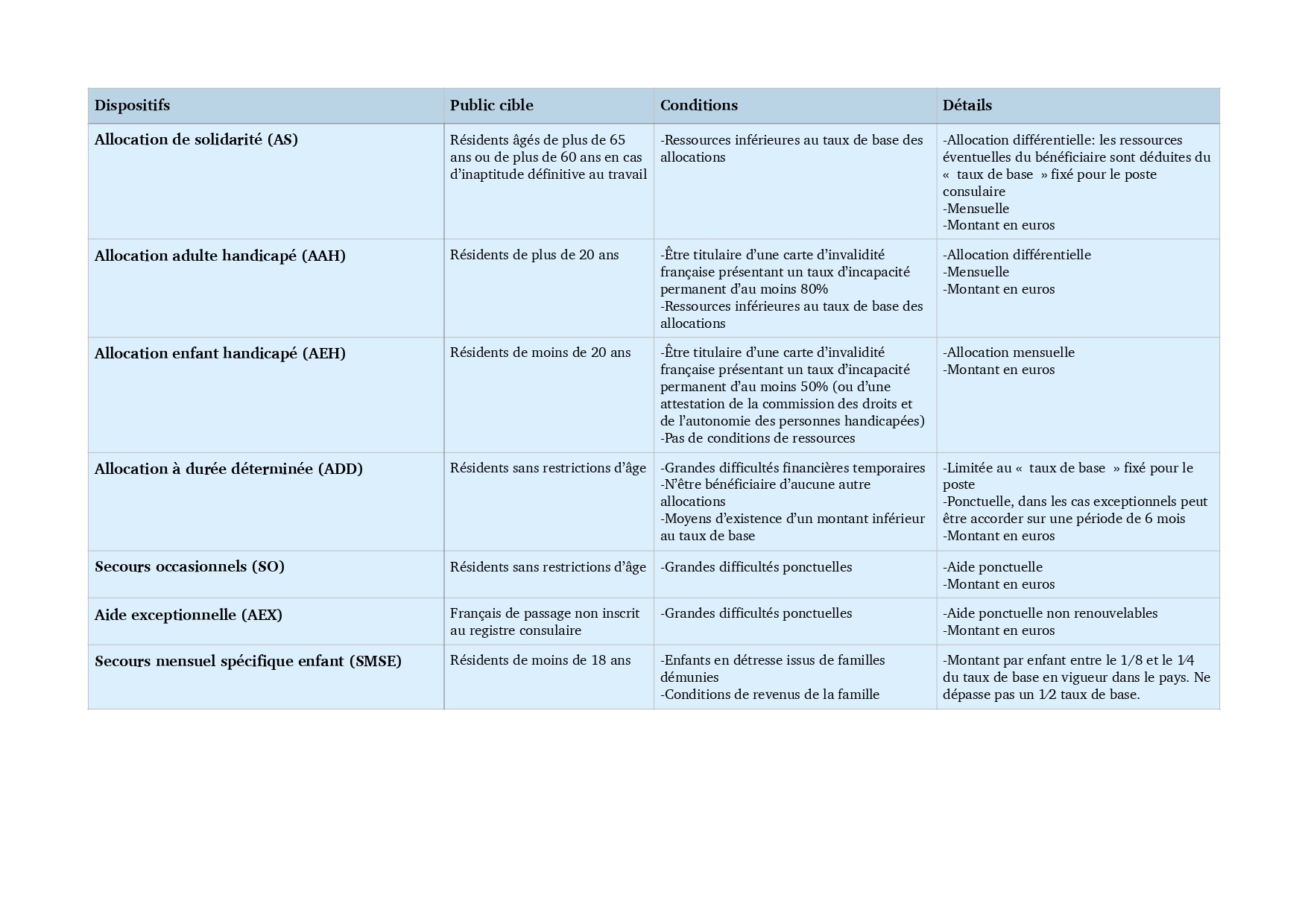 Tableau récapitulatif des aides sociales pouvant être mobilisées pour les Français de l’étranger dans le besoin