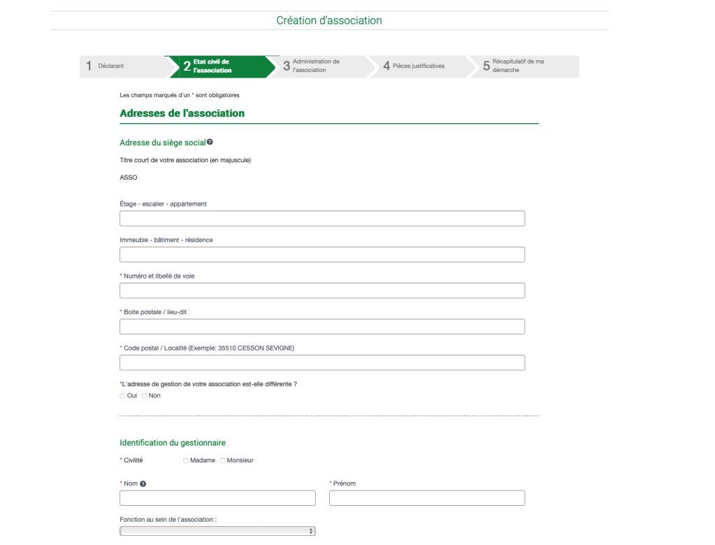 - Ensuite, renseignez plusieurs informations concernant l’organisation. Il s’agit de “l’état civil de l’association”